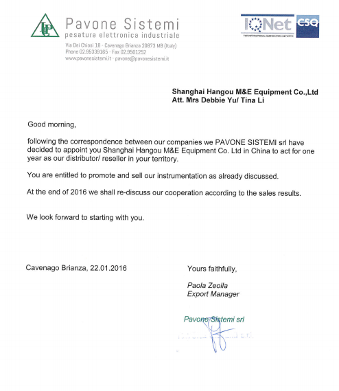 2016年1月意大利pavoneSistemi公司上海航歐機電設備有限公司