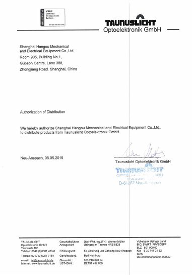 TAUNUSLICHT工廠上海航歐中國區銷售上海航歐機電設備有限公司從事進口機電設備、儀器儀表等疑難備品備件的銷售,是經營世界各地進口設備的現代化企業。